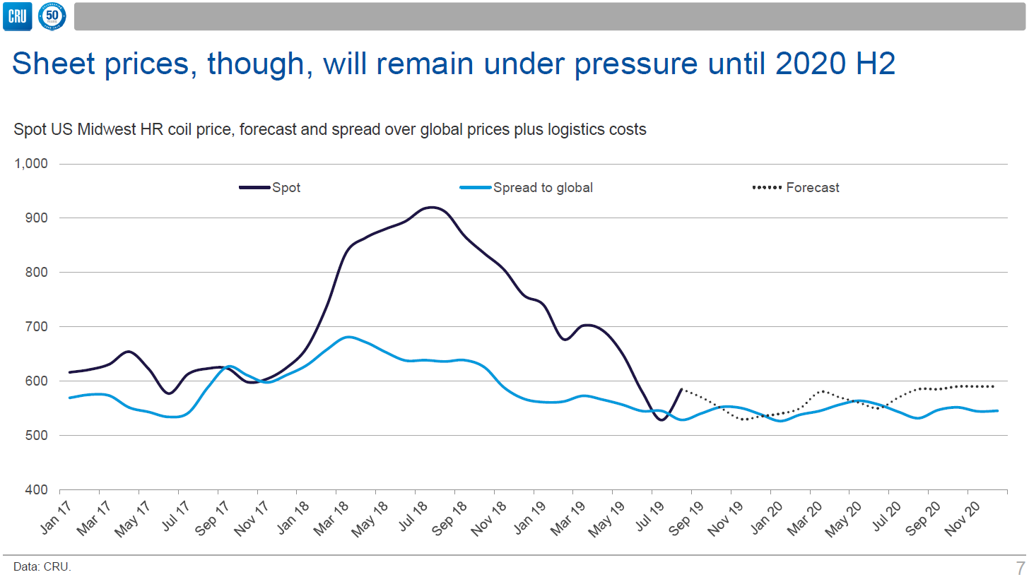 Price momentum is slowing despite the recent mill price increases. CRU expects hot rolled prices to dip toward the end of the year with $530 per ton likely in December. CRU currently forecasts an average hot rolled price of $572 per ton for 2020, down from a 2019 average of $612.