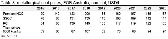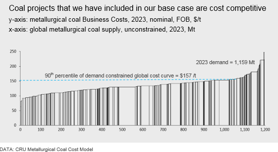 As explained above, while we expect demand for metallurgical coal imports to increase in the medium term, there is also sufficient supply in the pipeline to meet this incremental demand. For this reason, we believe prices will not be significantly different from those one would expect under steady-state conditions; there are neither significant barriers to entry for our base case supply forecast or factors that would result in a particularly weak market for an extended period. Therefore, prices will average around the 90th percentile of the demand constrained global cost curve, which is $157 /t, FOB Australia, nominal basis in 2023.