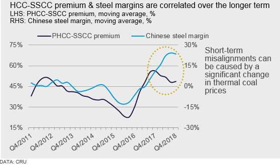 Historically, we have observed a significant degree of correlation between average PHCC-SSCC premiums and average steel margins over a longer period, as you can see in the chart above. But, the switching potential of thermal coal to SSCC leads to misalignments in the short term, all other things remaining constant. In this way, while steelmaking margins are the key driver of PHCC premiums over SSCC, thermal coal pricing can also play a role. Therefore, to forecast SSCC prices going forward, we have used our view of steel industry profitability and thermal coal prices as key inputs.