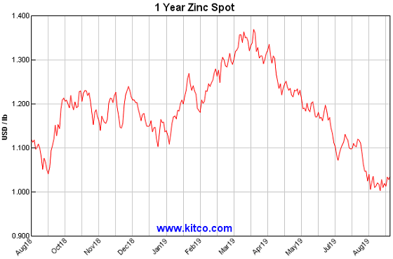 Zinc prices have consecutively declined since spring when they peaked at $1.3695 per pound in April. The current price for zinc is about $1.0324 per pound.