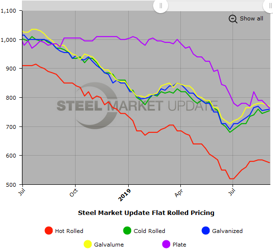 SMU Note: Below is a graphic showing our hot rolled, cold rolled, galvanized, Galvalume and plate price history. This data is available here on our website with our interactive pricing tool. Note that plate prices are not yet available on our website, but we are in the process of adding that dataset. If you need help navigating the website or need to know your login information, contact us at info@SteelMarketUpdate.com or 800-432-3475.