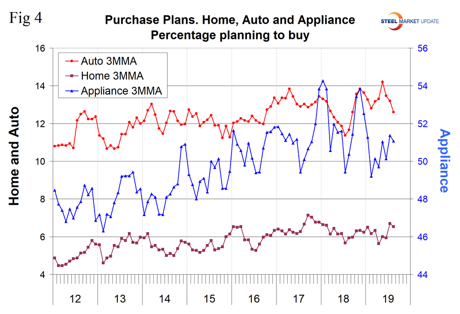 Consumer spending measures in August indicated that year-over-year plans to buy a car have increased by 12.6 percent, though there has been a decline in the last three months Plans to buy an appliance have been improving erratically for six months and plans to buy a house have not made progress in almost two years (Figure 4).