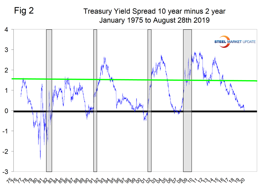 The most significant change in the latest data was that on Aug. 27 the treasury yield spread, 10-year minus two-year, dipped into negative territory with a value of -.04 percent. The last time the 10/2 spread was negative was June 6, 2007 (Figure 2). A negative spread has predicted every recession since the mid 1960s with a six- to 24-month lead time (and just one false positive). Or to put another way, if the 10/2 yield curve inverts, there’s a 90 percent historical probability that a recession is coming in the next two years. At the end of August, the spread was only very slightly negative, but certainly needs to be on our radar screens as we move into September. The other significant change in the August data was that the ISM manufacturing index declined in our view from positive to neutral. This index has been declining steadily for almost a year and is approaching the critical 50 level. An index value above 50 indicates that the manufacturing economy is generally expanding; below 50 indicates the opposite.