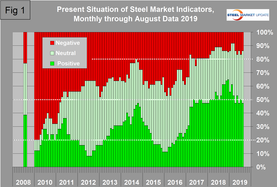 Our view of the August data is that the number of indicators we regard as strong has been hovering around 50 percent for the last six months with only 14 percent being weak. The balance are in the historical mid-range (normal). Figure 1 shows the history of our view of the present situation data since January 2010 on a percentage basis, and on the far left of the chart is the August 2008 situation immediately before the recession struck the steel business in September that year. Our view of the August data is that of the 36 indicators, 17 are currently positive, 14 are normal and five are negative. This was a decrease of one positive, of one negative and an increase of two normal since our July update. Our intent in using the word normal is to say that this indicator is in the mid-range of historical data.