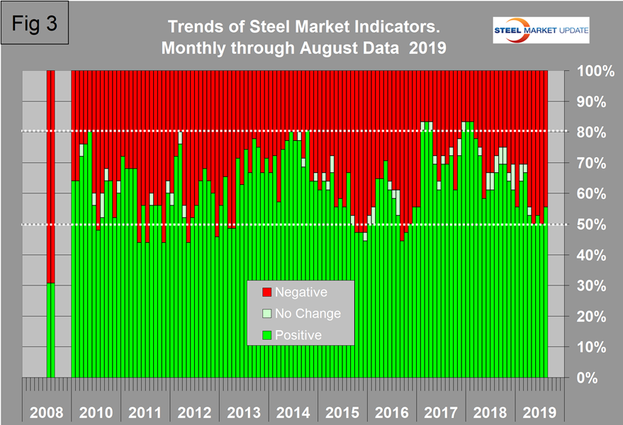 Figure 3 shows the trend of the trends and the pre-recession situation at the far left of the chart. In August 2019, 20 indicators were trending positive and 16 negative. Ten indicators reversed direction in the August data resulting in a net increase of two positive and a net decrease of two negative. Three of those reversals were in the raw materials section where iron ore trended negative and scrap and pig iron trended positive. The only trend change in the construction and manufacturing sections was that the producer price index of commodities reversed direction and trended positive. We regard this as a leading indicator of industrial construction. All of the construction indicators are trending positive and three of the five manufacturing indicators are trending negative. As a result of the construction and manufacturing situation, the shipments and supply of long steel products are trending positive and the reverse is the case for sheet steel products. There has been deterioration in the number of positively trending indicators since February 2018.