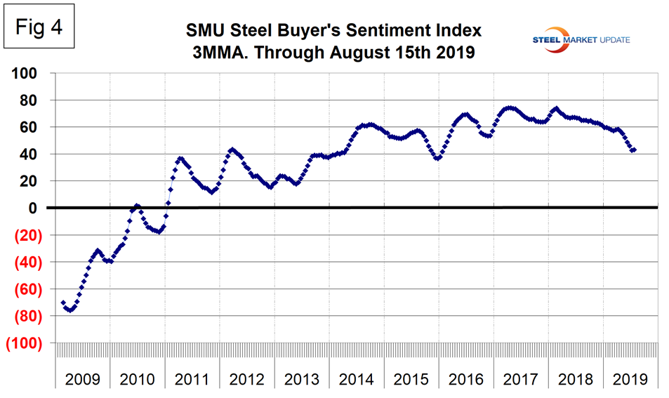 As a reality check for this report, we include here Figure 4, which is SMU’s Steel Buyers Sentiment index. Readings are developed during the twice monthly SMU market surveys. SMU Steel Buyers Sentiment is a measure of the current attitude of North American buyers and sellers of flat rolled products regarding their company’s opportunity for success in today’s market. A reading above the neutral point of zero indicates that a preponderance of buyers have a positive attitude. The index has been deteriorating since mid-February last year. The mid-August value was still positive 43.2, but down from a peak of 73.8 in February 2018.