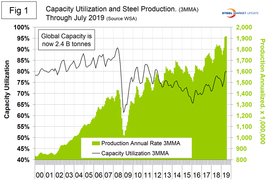 Capacity is calculated to be 2.4 billion metric tons and capacity utilization in July was 79.0 percent, according to the latest Steel Market Update analysis of World Steel Association data. In the months of April through July, Chinese production exceeded an annual rate of one billion metric tons.
