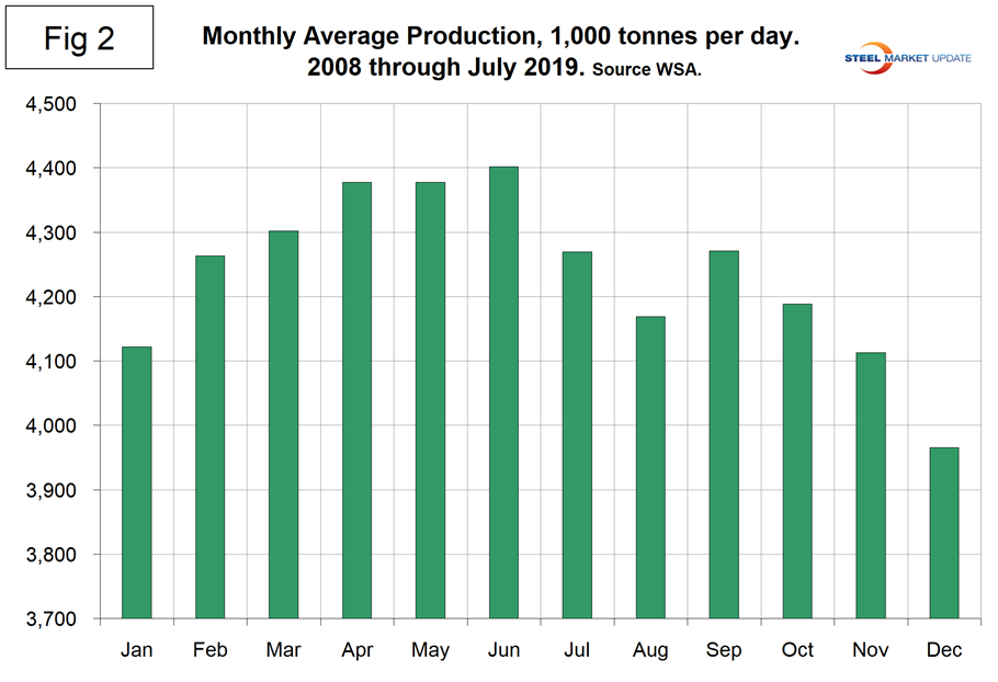 On average, global production on a tons-per-day basis peaked in the early summer in the years 2010 through 2016, but in 2017 and 2018 the second half downtrend was delayed until the fourth quarter. Figure 2 shows the average tons per day of production for each month since 2008. On average, July decreased 3.01 percent. This year, July decreased by 4.59 percent.
