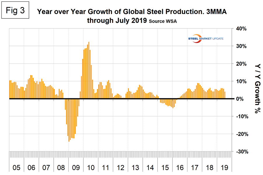 Figure 3 shows the year-over-year growth rate of global production since January 2005. Growth in three months through July was 4.0 percent, down from 5.9 percent in April and May and 5.6 percent in June. All of this growth occurred in China. The rest of the world growth of steel production was negative 0.8 percent in three months through July.
