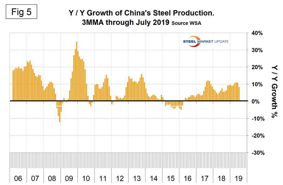 Figure 4 shows China’s production since 2005. As just stated, global steel production was up by 4.0 percent in three months through July year-over-year and China was up by 8.3 percent, both with negative momentum. In the three months May through July, world steel production excluding China contracted by 0.8 percent.
