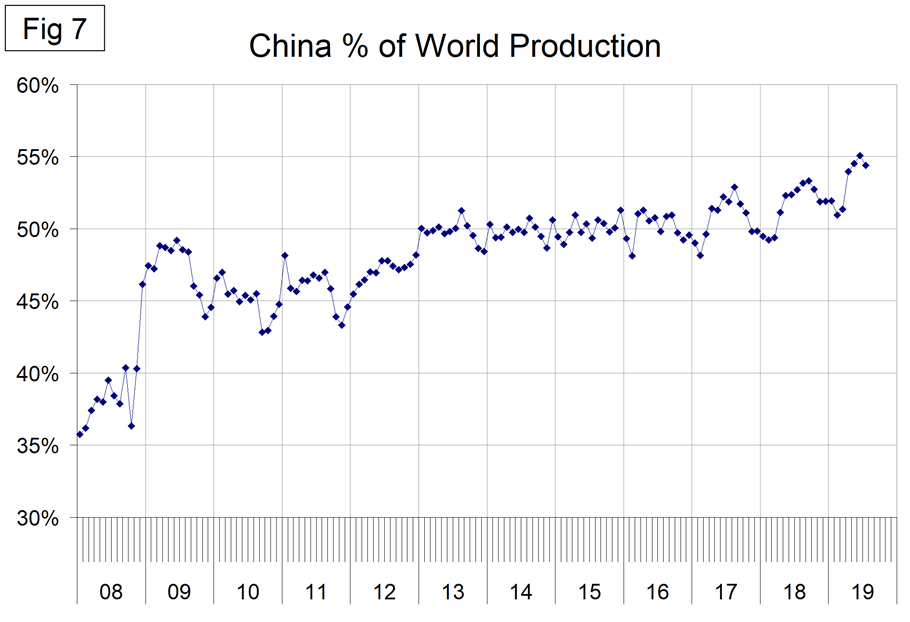 Figure 7 shows the growth of China’s share of global steel production, which in July was 54.4 percent.