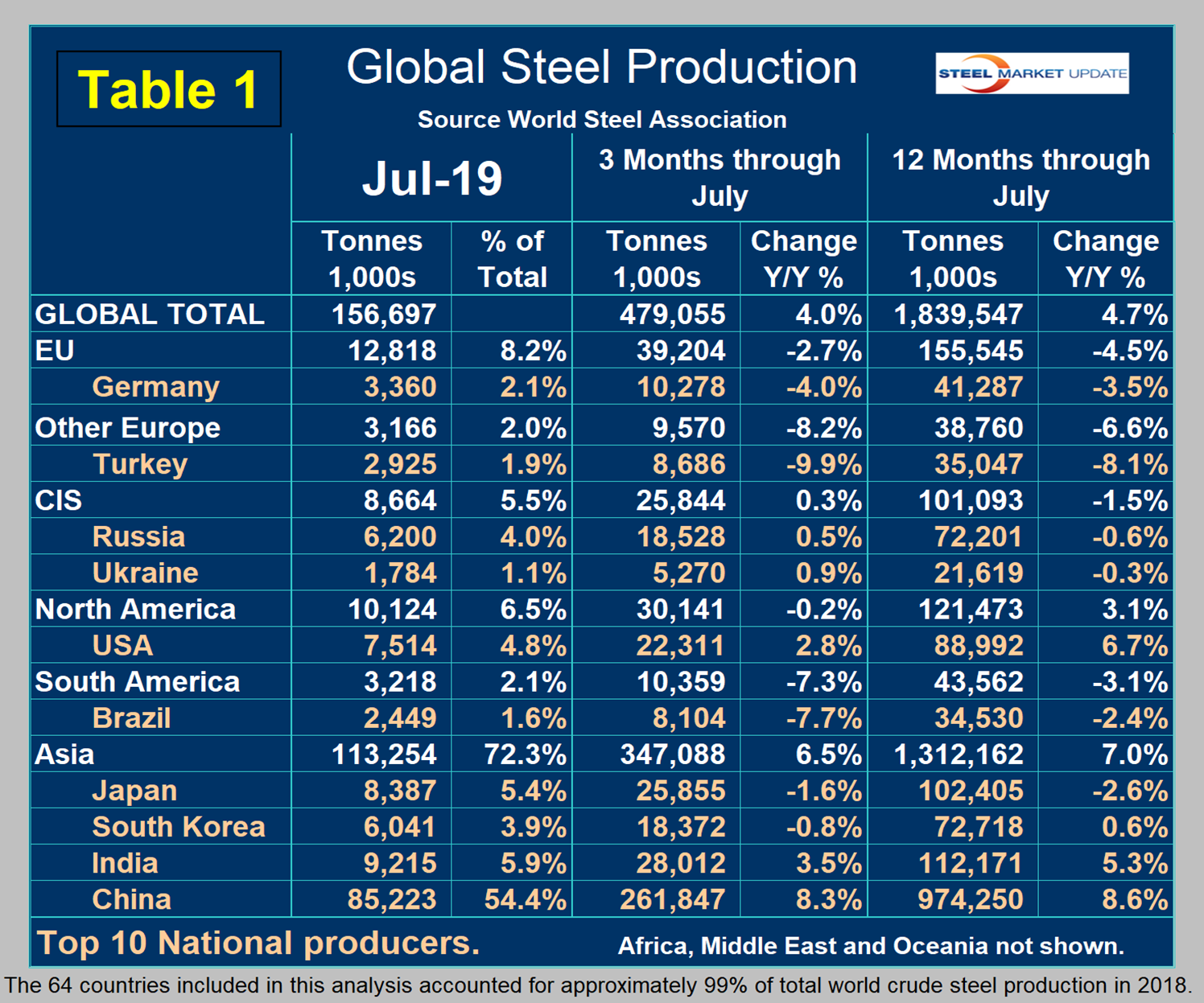 World steel production is down this year. Between May and July, global steel production declined by 4.1 percent. For the year, steel output is down by 0.9 percent, excluding China which continues to overproduce.