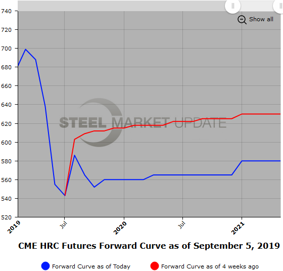 In an HR futures market that was already skewed to the downside due to more selling interest than buying interest, lower forecasted HR prices coming out of the Steel Summit in Atlanta in late August by various analysts and economists left the HR futures market with buyers interests at much lower levels. ($555/ST)