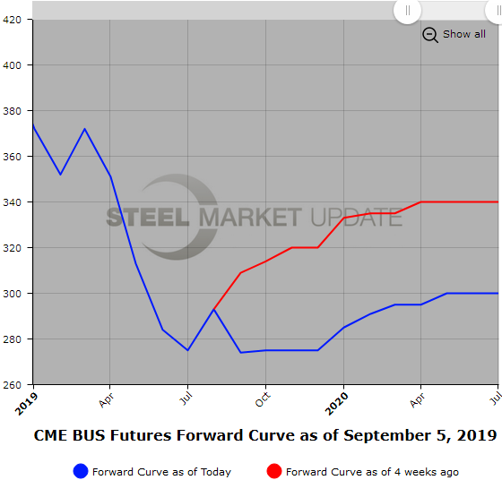 BUS futures have also tracked the decline in HR futures with the curve easing about $45/GT on average for 12 months forward. The current mid value for 1H’20 BUS futures is about $295/GT which is about flat with last months BUS settlement. Natural futures buyers remain scarce on the back of the steep price decline in HR futures. Quiet export market for 80/20 scrap has also put some further downward pressure on price expectations.