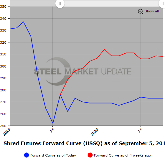 Below is another graph showing the history of the CME Group busheling scrap futures forward curve. You will need to view the graph on our website to use its interactive features; you can do so by clicking here.