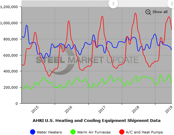 Below is a graph showing the history of total water heater, warm air furnace and air conditioner shipments. You will need to view the graph on our website to use it’s interactive features; you can do so by clicking here. If you need assistance with either logging in or navigating the website, contact info@SteelMarketUpdate.com.