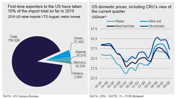 Rebar imports in August are on pace to be at their lowest level since December 2018. While the 40,800t total is a decline of 48 percent m/m and 69 percent y/y, Turkish exporters have become more competitive and have cargoes on the water heading to the U.S. Other, non-traditional, exporters like Oman have found openings as well in 2019, with first-time exporters to the U.S. capturing a tenth of total import volume so far (see chart). Market participants put import prices for rebar DDP Gulf Coast at $31.50 /cwt.