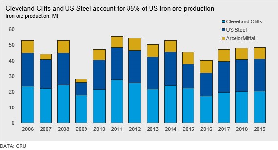 U.S. hot metal production has declined steadily over the last 20 years, from 54 Mt in 2000 to 28 Mt in 2019. This has resulted in domestic iron ore production falling steadily as the seaborne market has simply not been consistently profitable. The high production costs and logistical challenges of getting product onto the seaborne market make it very difficult for U.S. Steel, Cliffs and ArcelorMittal to compete with low-cost producers in countries such as Australia and Brazil. Therefore, the prospects for the country’s iron ore producers are closely tied to U.S. hot metal demand.