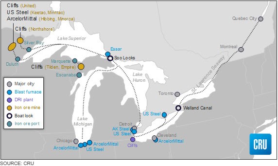 The geography of the Great Lakes basin allows easy and cheap access to North American steelmakers. However, exporting to the seaborne market is not as easy. All iron ore that is shipped on Lake Superior is loaded through the ports of Duluth, Silver Bay or Marquette. The lake connects to Lake Huron via the Soo Locks that are closed from January to March every year as the water freezes. Usually, iron ore is stockpiled during this time to ship as soon as the weather permits. However, at times of exceptional iron ore prices, companies in the past have railed ore from the Mesabi and Marquette Ranges, 550 km and 110 km respectively, to the port of Escanaba on Lake Michigan. There are no locks between Lakes Michigan, Huron and Erie. Ports on these lakes are accessible all year round, with the help of icebreakers, allowing ship transport to all the major BFs in the region.