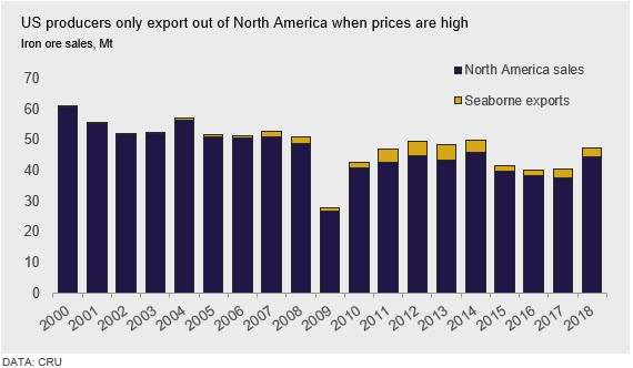 That being said, iron ore exports do increase when market conditions are favorable, such as when seaborne pellet prices are elevated and domestic steel prices are depressed. Exports were significantly higher during the iron ore price boom between 2011 and 2014 and, more recently, the high pellet premia caused by the Samarco and Vale dam accidents.