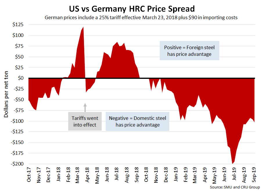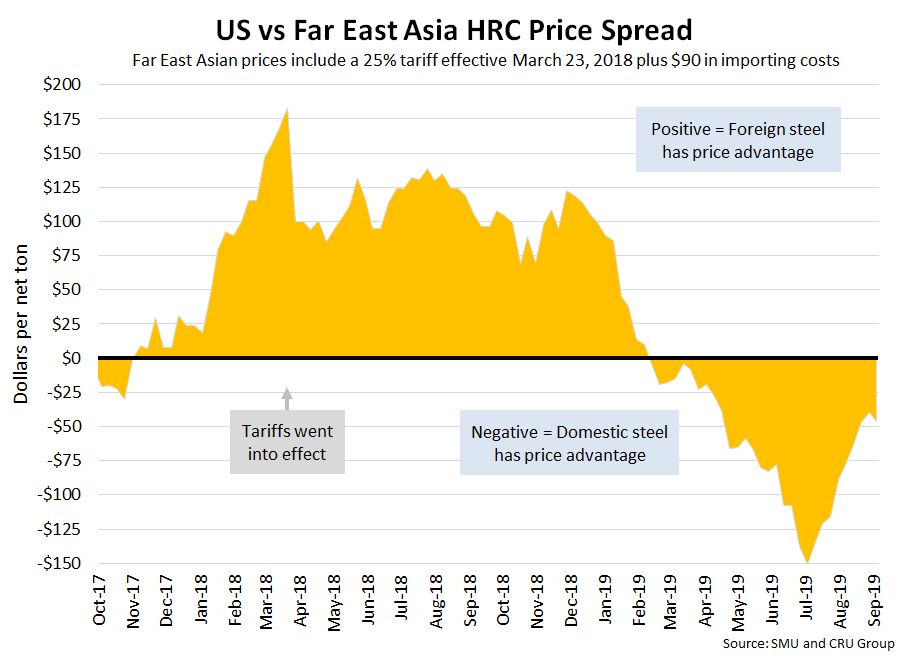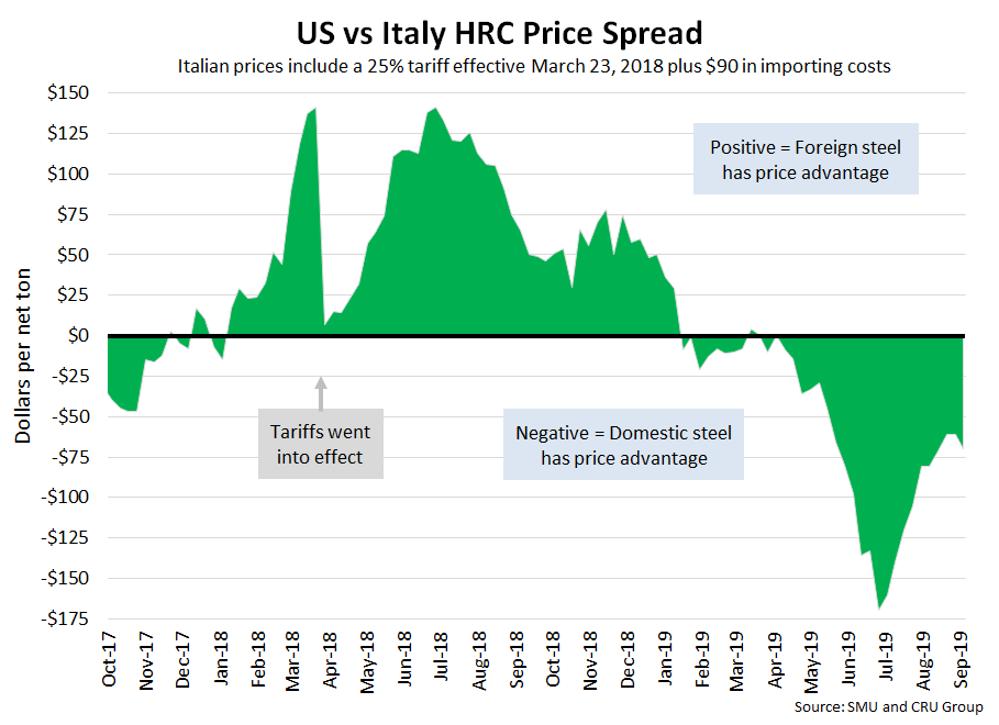 SMU includes a 25 percent import tariff effective on foreign prices after March 23, 2018. We then add $90 per ton to the foreign prices in consideration of freight costs, handling, trader margin, etc., to provide an approximate “CIF U.S. ports price” that can be compared against the SMU U.S. hot rolled price. Note that we do not include any anti-dumping (AD) or countervailing duties (CVD) in this analysis.