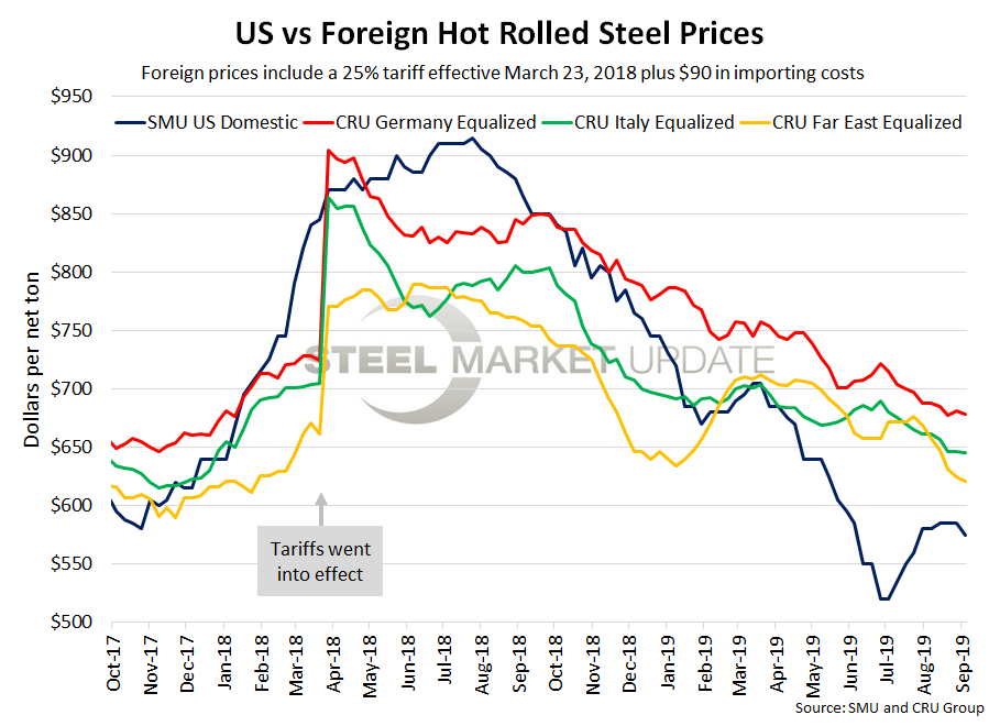CRU published Italian HRC prices at $444 per net ton, down $1 over both last week and two weeks ago. After adding tariffs and import costs, the delivered price of Italian HRC is approximately $645 per ton. Therefore, domestic HRC is theoretically $70 per ton cheaper than imported Italian HRC; the spread was $61 for the previous two weeks. U.S. prices have have now held this advantage for 22 consecutive weeks.