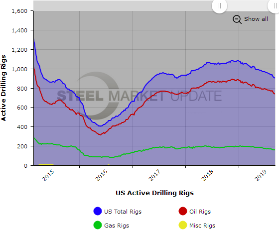 The U.S. active rotary rig count, an indicator of oil country tubular goods demand, declined this week, according to oilfield services company Baker Hughes. The number of active U.S. rigs fell by 6 to 898, with oil rigs down 4, gas rigs down 2, and miscellaneous rigs unchanged. Compared to this time last year, the 898 count is down 150 rigs, with oil rigs down 122, gas rigs down 26, and miscellaneous rigs down 2. See the first graph below for a history of active U.S. rig counts.