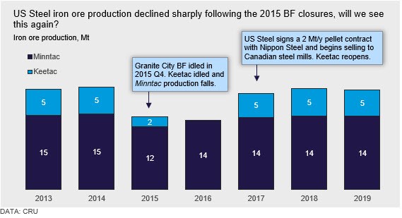 Now, the latest spate of BF idlings come at a difficult time in the seaborne pellet market. Pellet supply is strengthening, while demand in Europe, MENA, JKT and the U.S. weakens. With premium quality lump now being shipped from Baffinland and the return of Vale’s Brucutu mine, which is one of Vale’s key sources of pellet feed, it will be difficult for U.S. Steel to find buyers for its excess pellet production. Although the company was able to export at the high pellet premia during the period 2017-2018, we do not think that this arrangement is sustainable in the long term, especially as CRU expects further recovery of pellet shipments from Brazil in the coming years. Hence, the drop in U.S. pellet consumption is likely to force a reduction in iron ore production for U.S. Steel.