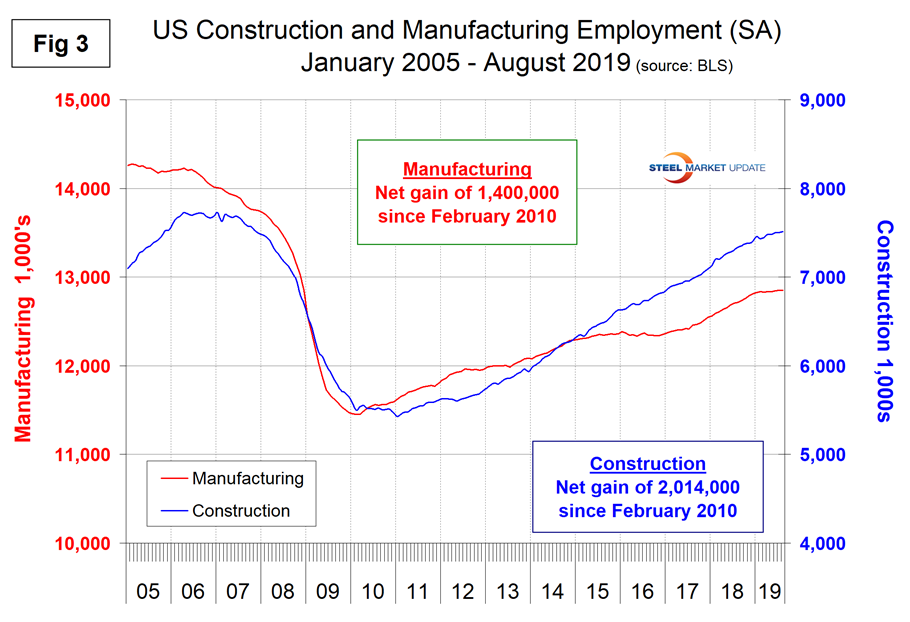 Construction was reported to have gained 14,000 jobs in August as manufacturing gained 3,000. Since and including January 2018, construction has added 421,000 and manufacturing 308,000 jobs. Manufacturing productivity improved by 0.2 percent in Q2 2019 after a gain of 0.9 percent in Q1 2019. Figure 3 shows the history of construction and manufacturing employment since August 2005. Construction has added 2,014,000 jobs and manufacturing 1,400,000 since the recessionary employment low point in February 2010.