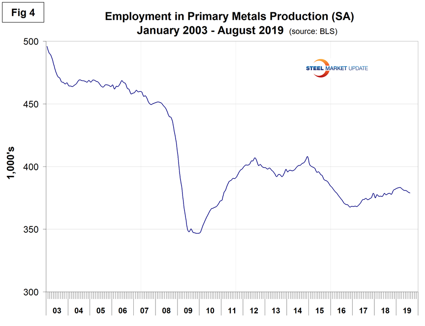 Table 1 shows that primary metals lost 800 jobs in August, and in the last 12 and 24 months has gained on a percentage basis less than manufacturing as a whole. Figure 4 shows the history of primary metals employment since January 2003. There has been a decline of 4,200 jobs in the last four months.
