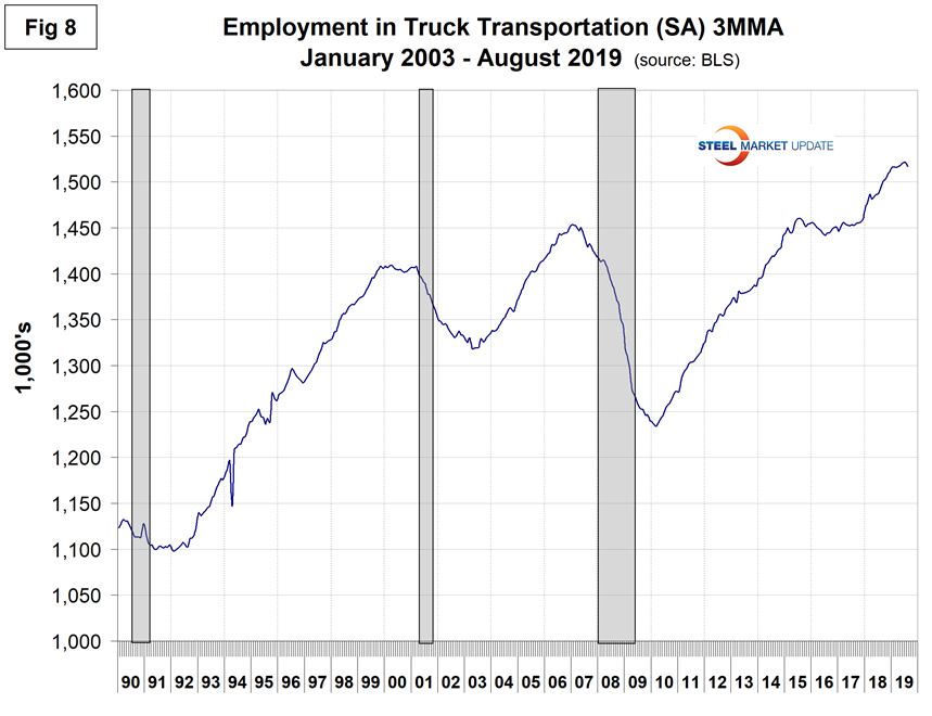 Trucking lost 4,500 jobs in August, resulting in a 12-month gain of 21,400. Employment in truck driving is one of SMU’s recession monitors and Figure 8 suggests that the economy is strong, but a couple more months of losses similar to August would be a cause for concern.