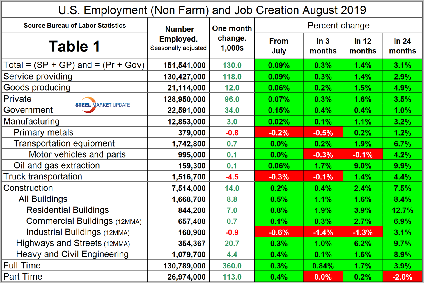 Table 1 breaks total employment down into service and goods-producing industries and then into private and government employees. Most of the goods-producing employees work in manufacturing and construction; the components of these two sectors of most relevance to steel people are broken out in Table 1.