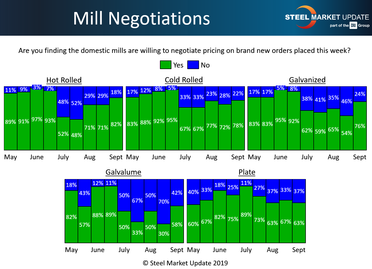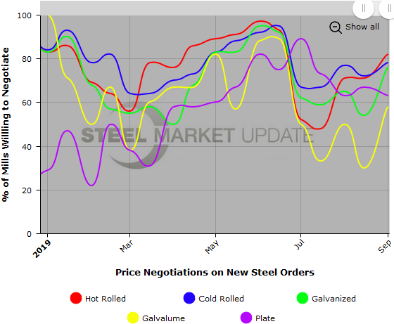 Suppliers of galvanized steel appear much more likely to discuss discounts than they were a few weeks ago. Seventy-six percent said their galvanized suppliers are willing to deal, a jump of 22 percentage points from mid-August. Just 24 percent of respondents reported galv mills declining to compromise on price. The majority, 58 percent, said the mills are now also open to price talks on Galvalume.