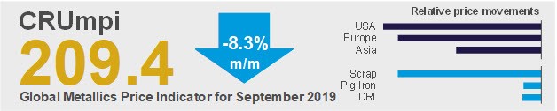 The pervasiveness of steel market weakness came to the fore this month, particularly for steel long products, leading to a sharp drop in scrap prices in almost every market we assess. Consequently, the CRU metallics price indicator (CRUmpi) dropped by 8.3 percent m/m to 209.4 (see chart), the lowest level since November 2016.