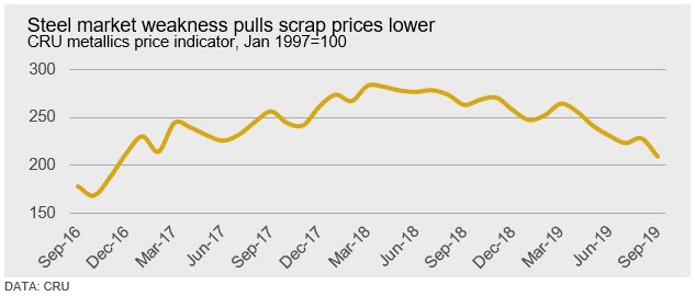 Following standout gains in August, U.S. scrap prices were some of the hardest hit in September as oversupply amid weak demand from mills saw prices drop by up to $40 /lt m/m. That said, virtually every other scrap market we assess suffered falls of $10-35 /t m/m. While still falling, ore-based metallics prices fared better and cost support remains, as weakness in flat-rolled steel markets has been less severe.