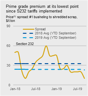 Shredded scrap prices are now at their lowest level since November 2016. The relative abundance of shredded scrap has meant mills are sourcing more of this material compared to prime grades. This weakened demand for prime grades and reduced the premium for #1 busheling to an average of $24 /l.ton year-to-date 2019 compared to $33 /l.ton a year earlier (see chart). The spread now sits at $10 /l.ton for the first time since the implementation of Section 232 tariffs on steel imports in April 2018.
