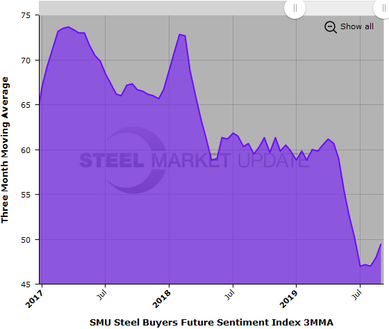 Steel Market Update’s Steel Buyers Sentiment Index saw a slight uptick this week, but not one big enough to indicate a significant change of direction. Industry sentiment has trended downward for much of the year and has been stuck in a mediocre range for the last few months over concerns about demand and pricing. Buyers’ attitudes remain well behind the level of optimism at this time last year.