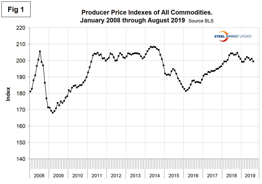 On Sept. 11, the BLS released its series of PPIs for more than 10,000 goods and services through August. For an explanation of this program, see the end of this piece. The PPI data are helpful in monitoring price direction, though there may be a lag between the BLS reports and spot prices for steel products. We have also concluded that the actual index values of the PPIs of different products cannot be compared with one another because they are developed by different committees within the BLS. We believe this data is useful in comparing the direction of prices in the short and medium term, but tell us nothing about the absolute value.