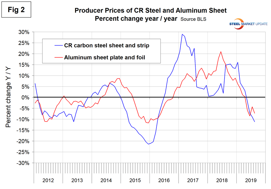 Figure 2 shows the year-over-year comparison of the price change of cold rolled steel sheet and flat rolled aluminum. The lines crossed in September last year and since then the price changes of steel and aluminum have been similar. In August 2019, the rate of change of the price indexes was negative 11.1 percent for steel and negative 7.3 percent for aluminum, both year over year.
