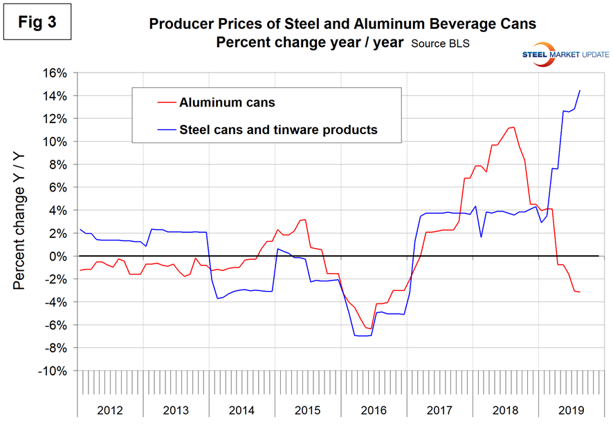 The composite producer price index of all commodities has been relatively stable in 2019, but tinware products are becoming very uncompetitive against aluminum.