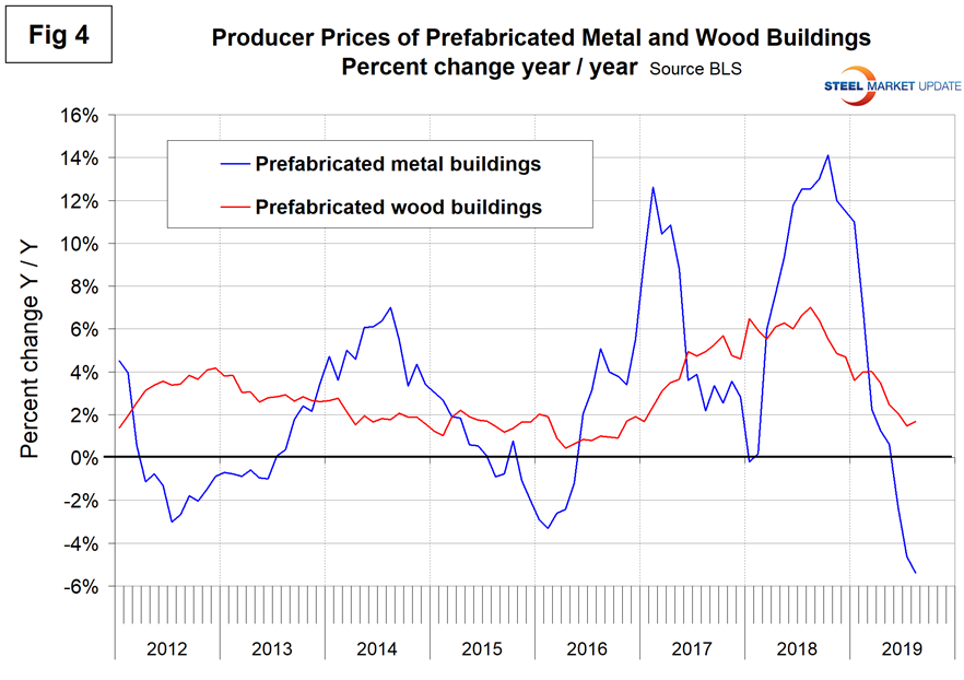 Figure 4 compares prefabricated metal with prefabricated wood buildings. In this analysis, steel has improved its competitive advantage this year. In 12 months through August, the PPI of wood buildings increased by 1.7 percent as steel buildings declined by 5.4 percent.