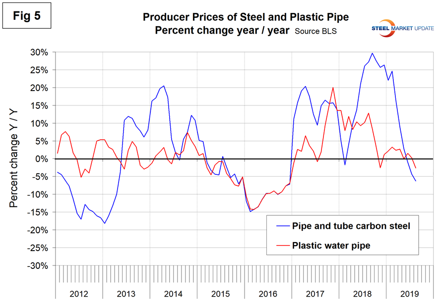 Figure 5 compares the price changes of steel and plastic pipe, which moved in opposite directions to the detriment of steel in 2018. Since then steel has come back in line with plastic.