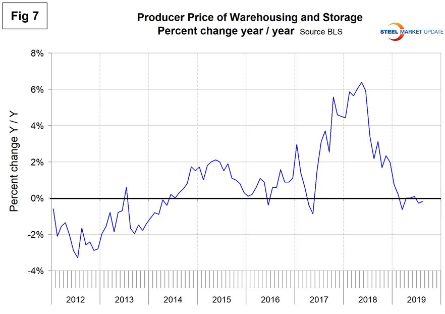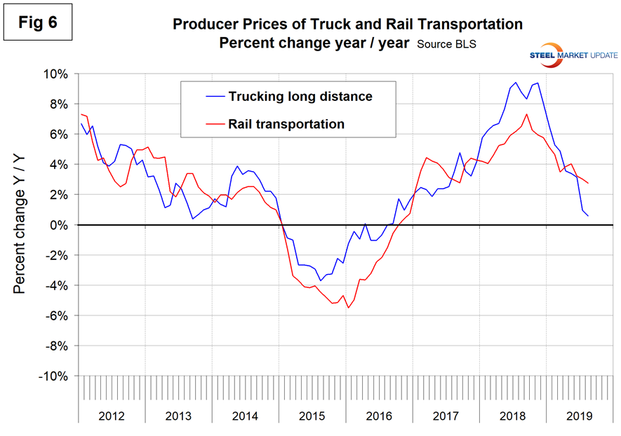Figure 6 compares the changes in the price of truck and rail transportation. The escalation of truck transportation prices exceeded those of rail almost every month from January 2015 through May 2019, but in July and August the price of rail transportation increased more than for trucking.