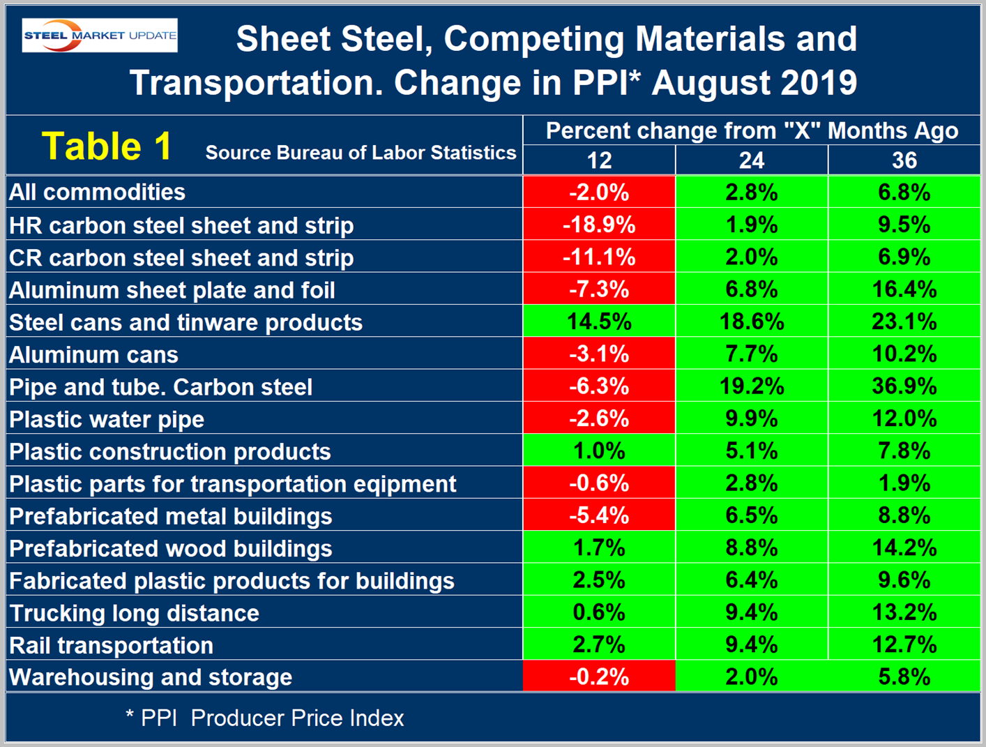 Table 1 is a summary of each segment that we examine on a year over one-, two- and three-year basis. The gain/loss pattern is shown by the color codes; we interpret rising prices as positive. We began this bimonthly analysis in January 2016 and the table has been predominantly green at the 24-month and 36-month level since February last year. In August, 10 of the 16 sectors were declining at the 12-month level, an increase from seven in our June analysis. The table includes direct comparisons where possible between steel and competing products, also some other plastic products for which there is no direct steel comparison and a measure of price changes for transportation, warehousing and storage. Some specific comparisons of steel and steel products with their competition are as follows. Please note the Y axes are not to the same scale.