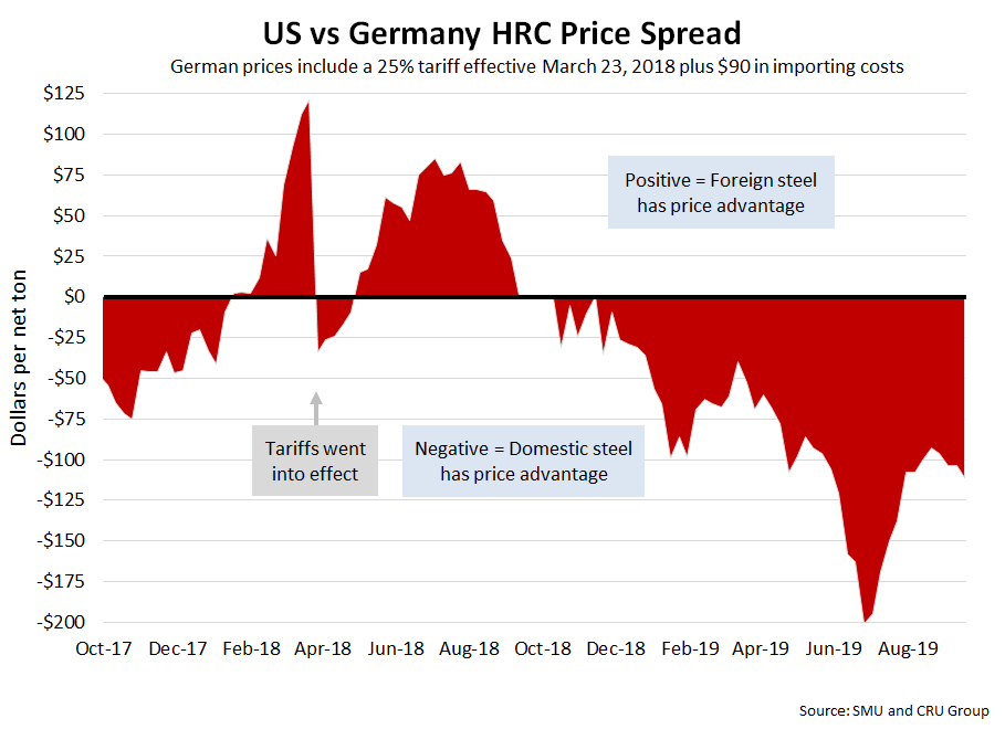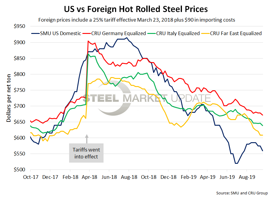 As of Wednesday, Sept. 18, the CRU German HRC price was $465 per net ton, down $6 from both the previous week and two weeks prior. Adding tariffs and import costs, that puts the German price at $671 per ton delivered to the U.S. The latest SMU hot rolled price average is $560 per ton, down $15 over both last week and two weeks prior. Therefore, domestically sourced HRC is theoretically $111 per ton cheaper than imported German HRC; the spread was $104 both last week and two weeks ago. U.S. prices have have held this advantage for 44 consecutive weeks now.