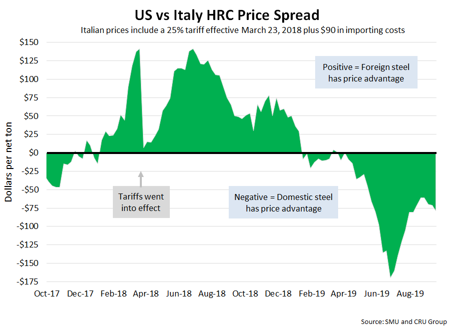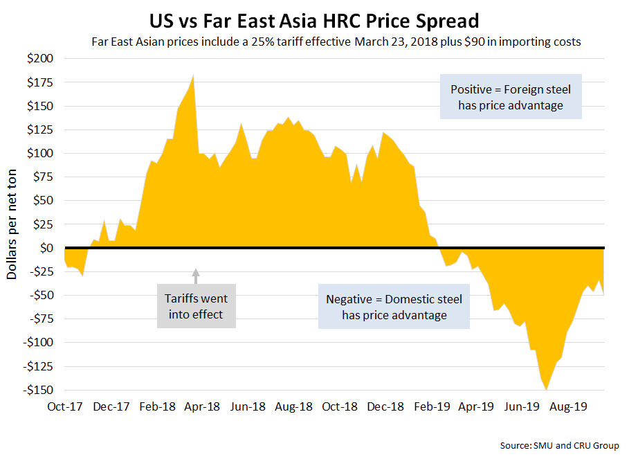 SMU includes a 25 percent import tariff effective on foreign prices after March 23, 2018. We then add $90 per ton to the foreign prices in consideration of freight costs, handling, trader margin, etc., to provide an approximate “CIF U.S. ports price” that can be compared against the SMU U.S. hot rolled price. Note that we do not include any anti-dumping (AD) or countervailing duties (CVD) in this analysis.