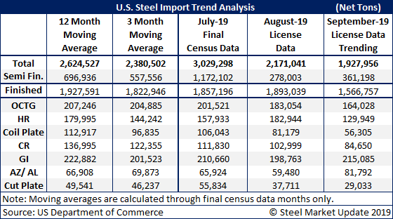 U.S. steel imports were trending considerably below average though mid-September at less than 2 million tons, based on Commerce Department license data.