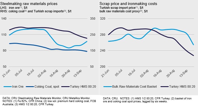 Turkish scrap prices have historically rebounded quickly once they fall to or below $200 /t. This is because supply dries up as scrap yards struggle to maintain profitability. We do not expect that scrap prices will reach this level, unless Chinese steel mills start exporting sizeable volumes of steel amid weak domestic conditions there. Chinese steel is currently higher cost than alternatives due to high domestic coal and scrap prices there. As steelmakers elsewhere are willing to accept prices below Chinese domestic prices, there is little incentive currently for exports, despite the drop in profitability.