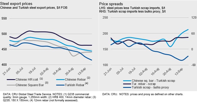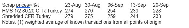 Turkish steel export prices weakened together with scrap prices; rebar and wire rod were down $10 /t w/w to $415 /t FOB Turkey and $450 /t FOB, respectively. Turkish steel export prices have declined by more than export offers from China since mid-August; Turkish rebar export prices fell $35 /t, compared to $19 /t for Chinese rebar. While relative stronger scrap and finished steel prices in Asia may have resulted in a potential opportunity for Turkish mills to sell material in the region, Indian offers are also highly competitive.