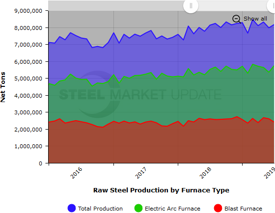 The chart below shows total monthly steel production (blue) broken down by electric arc furnace production (green) and blast furnace production (red).
